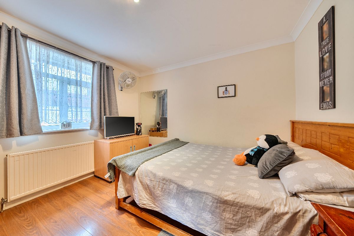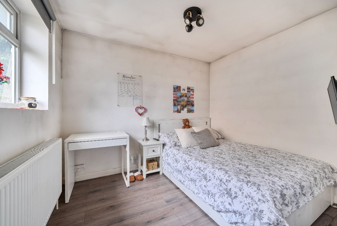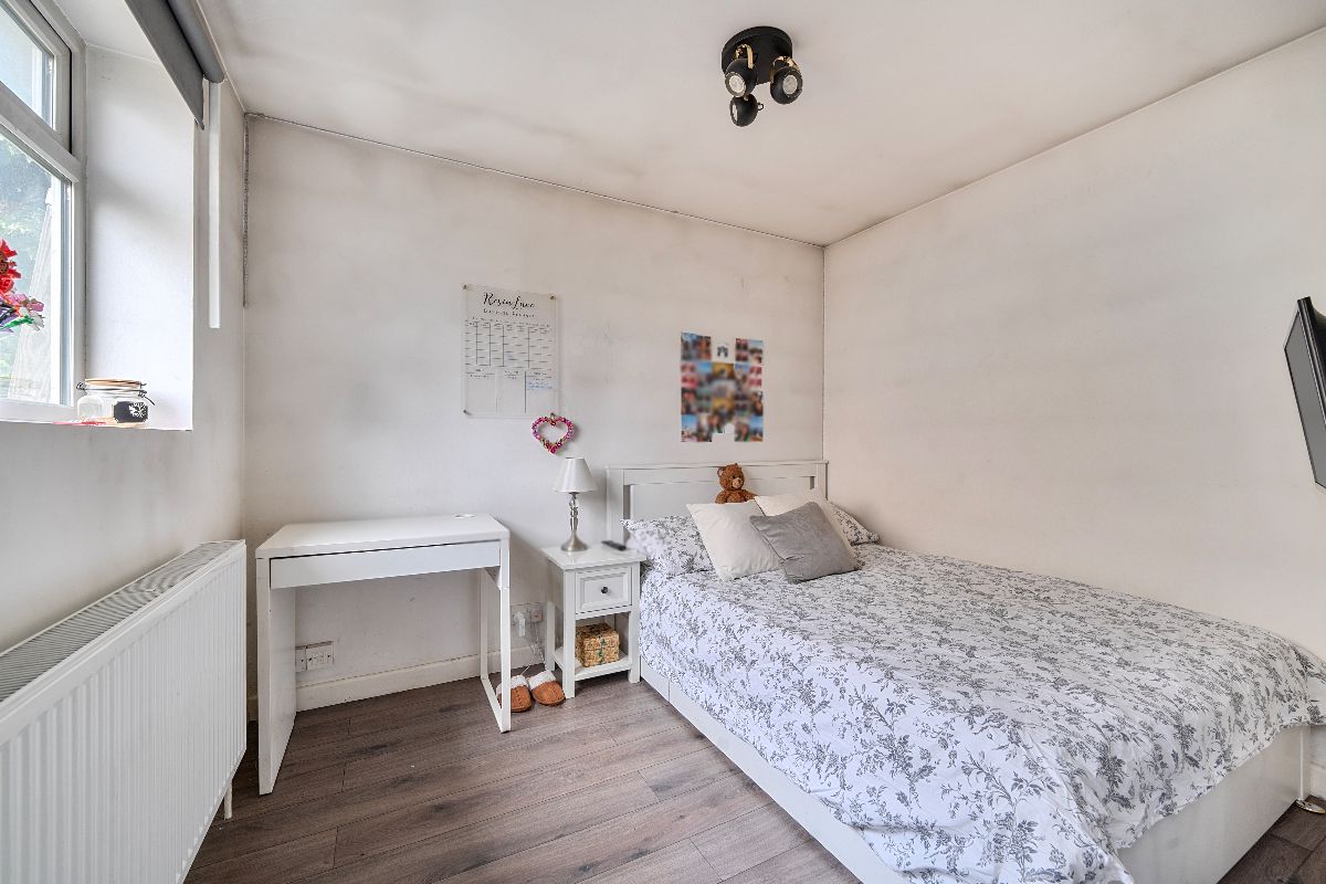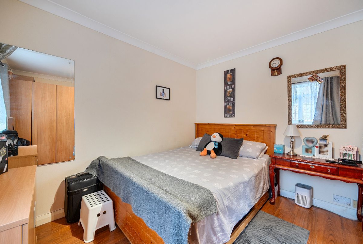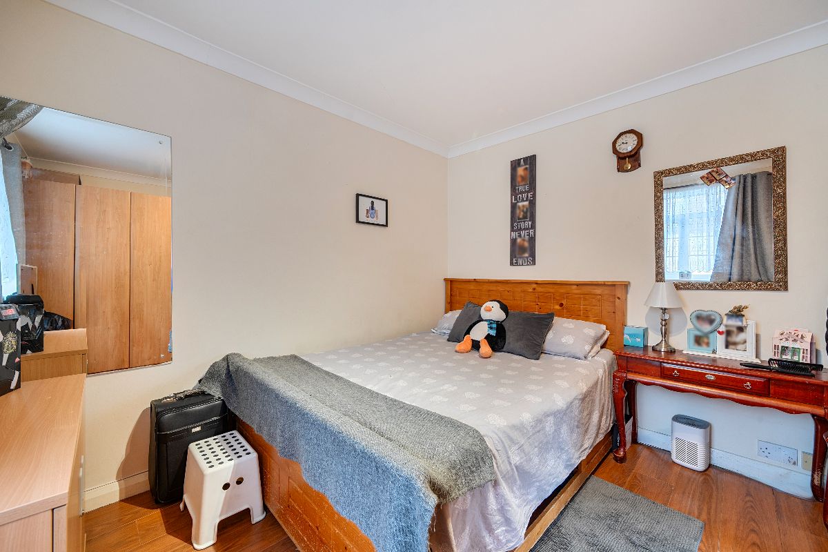 The paved rear garden features a self-contained granny annexe, currently used as a bedroom, complete with fitted wardrobes, its own boiler, and a shower room, along with additional side storage.