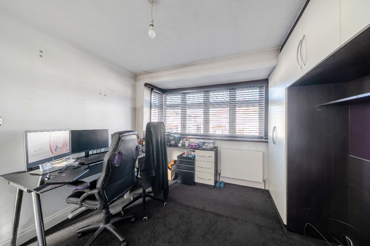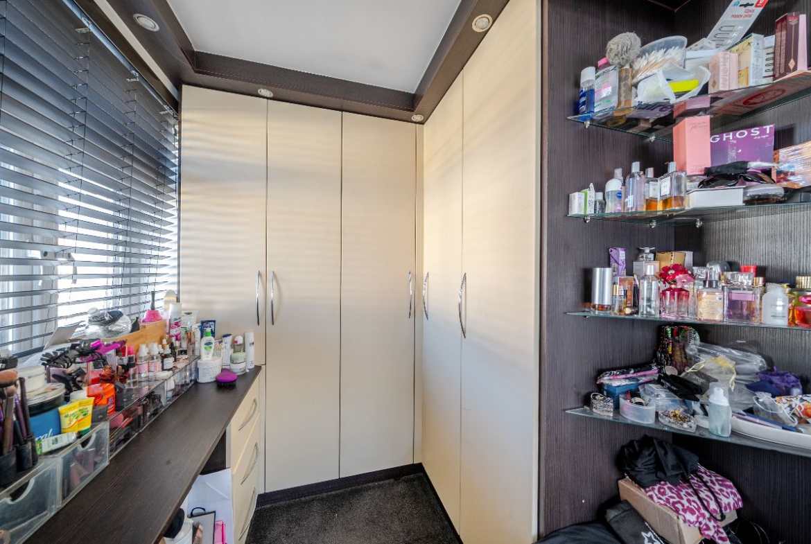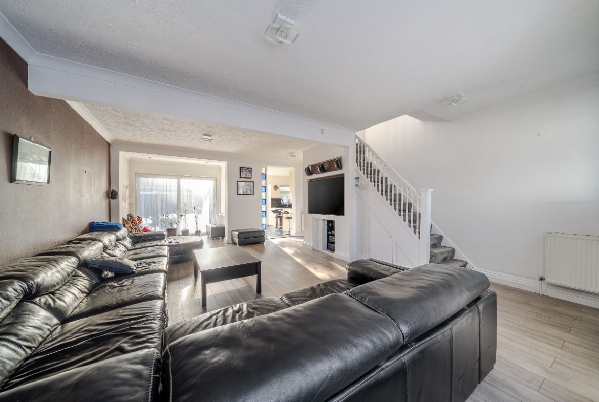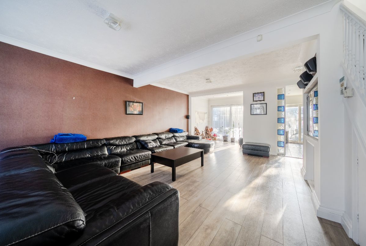 The ground floor offers a stunning open-plan living space, comprising a spacious living room with a modern media wall, dining area, and a fully fitted contemporary kitchen – ideal for family living and entertaining. A valuable side extension provides a ground-floor double bedroom and bathroom, perfect for guests, multi-generational living, or home-office use.