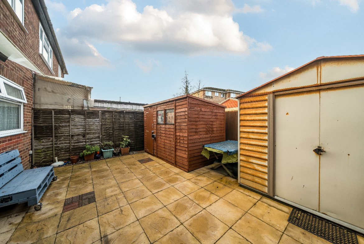To the rear, the property enjoys access to a generous private garden, which includes useful outbuildings/sheds, ideal for storage, hobbies, or potential home-working space.